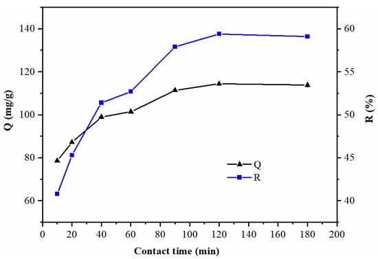 Moreover, the adsorbed Pb(II) repels the free Pb(II) in the solution via electrostatic repulsion, leading to a gradual decrease in the adsorption rate until an equilibrium is reached. At a contact time of 120 min, the removal ratio was 59.4%. Prolonging the adsorption time beyond this point did not significantly alter the removal ratio. At this point, the rate of adsorption and desorption were the same, indicating that the adsorption had reached a dynamic equilibrium [41]. In summary, during the adsorption process, both the removal ratio and adsorption capacity increased rapidly with contact time and then gradually reached an equilibrium. The adsorption capacity reached a maximum after 120 min (114.4 mg/g) and remained essentially constant thereafter.