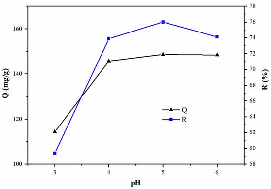 The adsorption of Pb(II) in solution by the adsorbents is strongly influenced by the pH value, as it determines the chemistry properties of the adsorbent surface and the types of metal ions. In general, the adsorption of cations is favored at pH > pHPZC [42]. If the pH value is lower than pHPZC, the zeta potential of the biochar expresses a net positive charge, which is responsible for the electrostatic repulsion of Pb(II) [43]. As the pH increases, this repulsive force becomes less and less intense. When the solution pH exceeds 6, Pb(II) gradually forms a Pb(OH)2 precipitate [44], which is unfavorable for adsorption. Therefore, considering the influence of PHPZC and avoiding precipitation, the pH was adjusted within the range of 3–6 for this experiment, and the experimental results are shown in Figure 6.