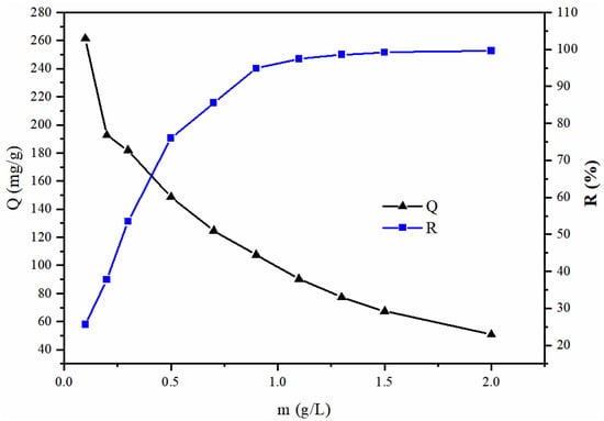 In the adsorption process, the adsorbent dosage is a significant factor that affects the adsorption performance. Additionally, it is also a crucial indicator of the economic cost associated with the adsorbent. The effects of AMBC dosage on its adsorption of Pb(II) are shown in Figure 7.