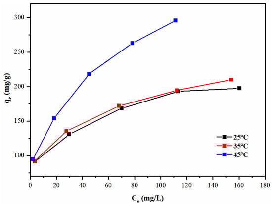 Adsorption experiments were carried out by mixing AMBC with varying concentrations of Pb(II) solution (50–250 mg/L) at different temperatures (25–45 °C) and shaking the mixture on a shaker at 130 rpm for 180 min. Figure 9 shows the isothermal adsorption line of Pb(II) adsorption by the AMBC.