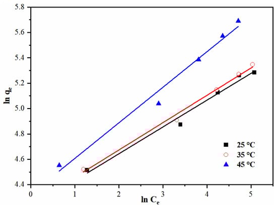 For the Freundlich model, a favorable adsorption process occurs when 0 < 1/n < 1. In Table 4, all the values of 1/n are less than 1, indicating that this process is favorable and consistent with the analysis of the Langmuir model.