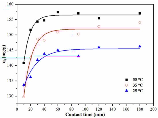The effects of temperature and contact time on the adsorption by AMBC are shown in Figure 12. It is evident from the adsorption curves that there was a steep increase within the first 40 min for AMBC, indicating that an increase in temperature is beneficial for adsorption. As time progressed, the adsorption curves tended to rise slowly, ultimately reaching equilibrium after 60 min.