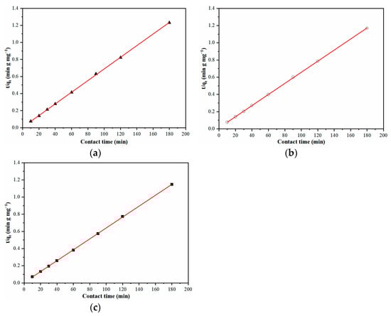 In order to gain insight into the rate-limiting steps of Pb(II) adsorption by AMBC, linearized pseudo-second-order kinetic models were employed. The equations for the pseudo-second-order kinetic model are shown in Equation (10).