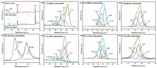 XPS can be used to determine the surface functional groups of the adsorbent as well as the state of the adsorbed metals, making it an important technique for adsorbent surface analysis. In order to better understand the possible adsorption mechanism, the XPS before and after Pb(II) adsorption by AMBC was analyzed, and the results are shown in Figure 15. The respective peaks of C 1s were deconvoluted into several possible spectra, having varied contents of oxygen-containing functional groups such as C=O/O-C=O (283.35 eV), C-O (286.36 eV), C-O-C (285.08 eV), C-C (284.69 eV), and C-S (284.23 eV) [52]. The O 1s peak spectrum can be deconvolved into four peaks located at 531.16 eV, 531.94 eV, 532.85 eV, and 533.68 eV, which are attributable to O-H, C=O, C-O, and O=C–O [27]. As shown in Figure 15d, there were three peaks at 169.07 eV, 168.44 eV, and 167.76 eV in the S 2p spectrum, corresponding to S=O, S-O, and S-C [53]. The XPS spectra of AMBC further confirmed that the sulfonated biochar formed -SO3H groups on the carbon framework after sulfonation. In summary, acidic oxygen-containing functional groups such as -OH, -COOH, and -SO3H were successfully connected on the surface of AMBC, which was consistent with the results of the FT-IR.