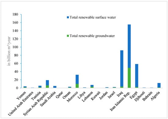The MENA region primarily relies on limited conventional water resources derived from surface and groundwater. Surface water sources, including rivers and dams, face unreliability and scarcity due to the arid climate. Groundwater, accessed through wells, is crucial for irrigation and drinking water but confronts challenges such as over-exploitation, depletion of aquifers, and increased salinity. This situation is clearly shown in the Gulf Cooperation Council countries, Djibouti, Libya, and Jordan, where both surface and groundwater resources are scarce, as shown in Figure 1. As the MENA region grapples with these multi-faceted water challenges, addressing issues of scarcity, pollution, and over-extraction becomes imperative for sustainable water management [,,].