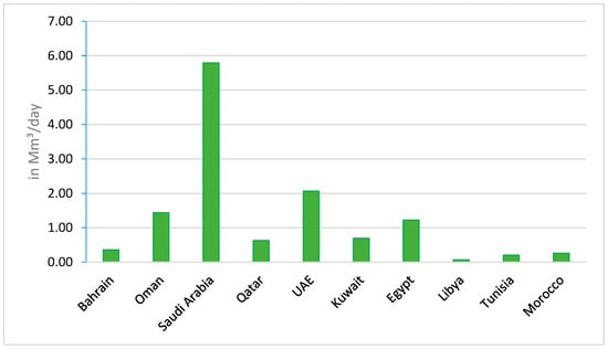 The International Desalination Association (IDA) highlights leading contributors to desalinated water production, including some Arabic Gulf countries and the United States. The MENA region holds a substantial 47.5% of global desalination capacity, with 62.3% allocated to municipal applications and 35% for industrial purposes [,]. Globally, the installed desalination capacity has reached 97.2 million m3 annually from 16,876 plants, contributing to a cumulative capacity of 114.9 million m3 from 20,971 projects [].