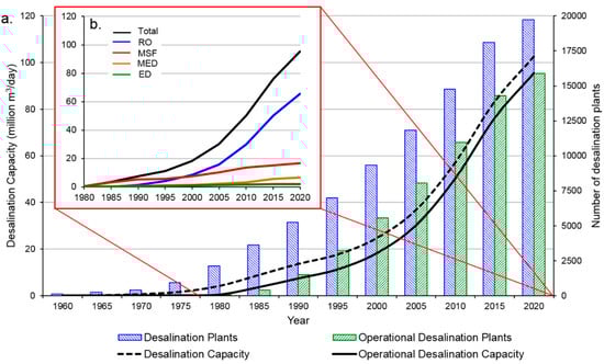 Notably, RO dominates both the global and MENA desalination markets, constituting 69% of desalination capacity and 84.5% of the overall plants [,]. Figure 2 illustrates the prevalence of RO technologies, depicting their respective capacities measured in Mm3/day across various countries in the MENA region. Furthermore, Figure 3 highlights the trends in desalination technologies, presenting (a) the total number and capacity of desalination units alongside their operational counterparts, and (b) the operational capacity distributed across different desalination technologies [].