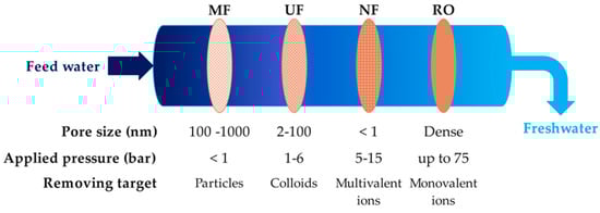 Membrane separation technology, a cornerstone for various fluid separations, offers advantages such as low running energy requirements, easy upscaling, simplicity, and no need for additional chemicals. The classification of membrane technology processes is organized based on different driving forces, including pressure, electrical, thermal, and concentration-driven processes. Figure 4 displays different types of pressure-driven membrane processes, which are categorized based on the pore size, applied pressure, and removing target []. Microfiltration (MF) membranes, which have the largest pores (0.1–1 μm), operate at low pressures (below 1 bar) to remove larger particles. Ultrafiltration (UF) membranes have smaller pores (2–100 nm) and slightly higher pressures (1–6 bars), which help to eliminate suspended solids and macromolecules. Nanofiltration (NF) membranes have even tighter pores (below 1 nm) and operate at moderate pressures (5–15 bars) to separate smaller molecules and multi-valent ions. Reverse osmosis (RO) membranes have a dense structure and operate under high pressure up to 70 bars for seawater desalination.