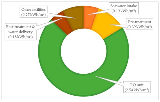 Distribution of energy consumption in SWRO desalination plants.