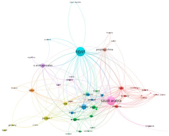 The analysis revealed a significant contribution from the MENA region to the field of solar-powered desalination. Notably, 391 out of 1262 articles identified globally originated from institutions within the MENA region. This translates to a percentage contribution of 30.1%. Furthermore, co-authorship analysis identified strong collaborative relationships among MENA region countries. Figure 7 visually depicts these collaborations, with larger nodes representing more productive countries (in terms of publication output) and the thickness and length of connecting lines indicating the strength of cooperation. The analysis identified Egypt as the leading contributor within the MENA region, with 144 published documents and a total link strength of 122. This is followed by Saudi Arabia with 129 documents and a total link strength of 173. Tunisia ranks third with 45 documents and a total link strength of 32. Jordan and the United Arab Emirates also emerged as significant contributors, with 32 and 31 documents and total link strengths of 36 and 38, respectively. These findings highlight the MENA region’s expertise and commitment to addressing water scarcity challenges. The strong publication output and collaborative research efforts demonstrate their active involvement and substantial contributions to advancements in solar-driven reverse osmosis desalination technology.