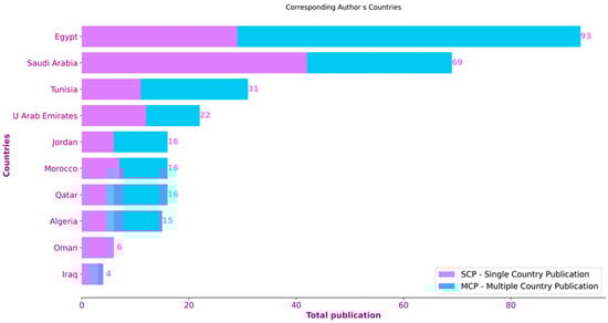 The bibliometric analysis not only revealed the substantial contribution of the MENA region to research on solar-powered desalination but also shed light on collaboration patterns. Figure 8 focuses on the countries of the corresponding authors to visualize these patterns. It differentiates between articles with a single corresponding author affiliated with a MENA country (single country publications—SCP) and those with corresponding authors from multiple countries (multiple country publications—MCP). The analysis identified Saudi Arabia as a leader in international collaboration within the MENA region. Notably, 42 out of 69 articles with a corresponding author affiliated with a Saudi institution involved collaboration with researchers from other countries. This translates to a significant percentage (60.1%) of their research output involving international partnerships. This is followed by Egypt with 29 MCPs out of 93 articles and the United Arab Emirates with 15 MCPs out of 22 articles. These findings highlight that MENA countries can position themselves at the forefront of solar-powered desalination advancements, contributing to a more secure and sustainable water future for the region.