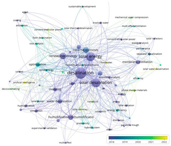 Overlay analysis is an effective bibliometric technique for tracking the evolution of research topics and identifying emerging trends over time. By examining the occurrences and average publication years (APY) of keywords, we can gain insights into the current focus and predict future directions in the field of solar-powered desalination. To capture the most recent advancements, we focused on the period between 2016 and 2023. Figure 9 depicts these temporal trends using an overlay visualization, where keywords are color-coded by publication year: navy blue indicates earlier appearances, while yellow highlights the most recent publications. Based on the overlay analysis, several promising trends in solar-powered desalination in the MENA region can be anticipated: