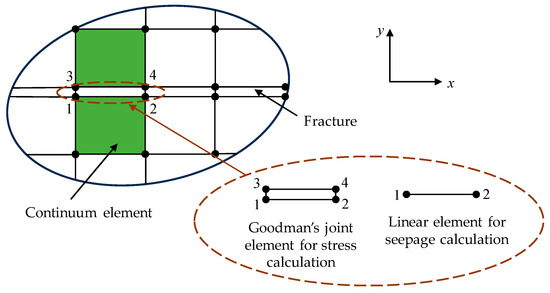 When conducting deformation analysis of fracture media considering seepage effects, two sets of node and element information come into play: equal-thickness Goodman’s joint elements for stress analysis and line elements for seepage analysis. As depicted in Figure 3, these two sets of information employ identical element numbers to denote the same computational domains, both corresponding to fractures, ensuring accurate transmission of all coupled parameters across all elements during the computational steps. It is worth noting that the line elements shown in Figure 3 do not possess thickness. However, for the computation of fracture permeability matrices, their thickness is assigned based on the joint widths at the current time step during the coupling calculation with the stress field.