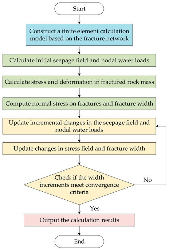 By incorporating the obtained fracture width changes into the iterative computations of both the flow field and stress field, the final flow field and deformation field can be determined. The analysis process is illustrated in Figure 4.
