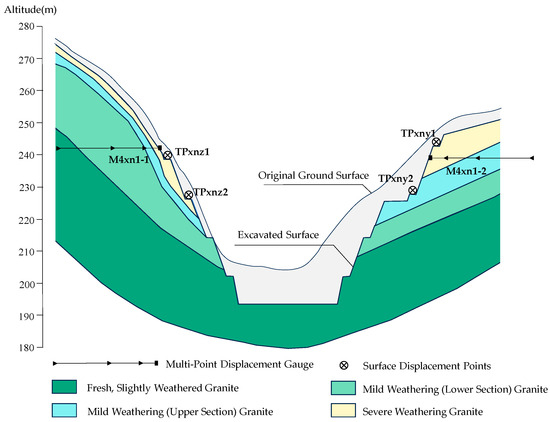 Our study focuses on the rock slope segment stretching from 0 + 114.5 to 0 + 162.5 m downstream of ZN Pumped Storage Power Station’s lower reservoir, with elevations ranging from 190 to 280 m. Based on the information provided by the design department, the positions of the monitoring instruments and the geological cross-section of the typical profile are shown in Figure 6.