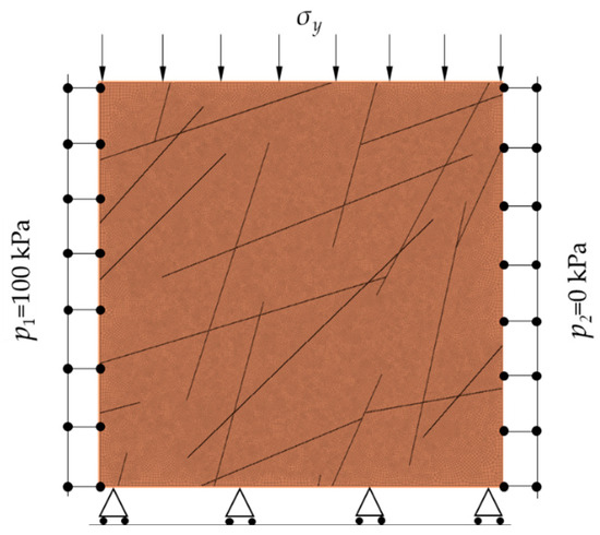 For the boundary conditions, as depicted in Figure 9, the model’s bottom was constrained as a fixed boundary, the left and right sides were subjected to horizontal link constraint boundaries, and normal loads were applied to the top and bottom boundaries. Regarding seepage boundary conditions, the left boundary of the model had fixed water pressure , and the right boundary had fixed water pressure . The top and bottom were treated as impermeable boundaries.