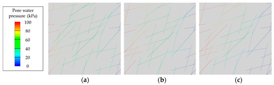 Assuming that the rock is an impermeable medium and applying the loading and hydraulic boundary conditions to the rock mass analysis units, the seepage field within the fracture network is simulated. Taking III2A rock mass under a load of as an example, the distribution of fracture water pressure in the rock mass analysis units on the 10th, 20th, and 50th days is shown in Figure 10a–c. From the figures, it can be observed that the fluid infiltration is very slow, and, with time, the pore water pressure gradually increases from left to right.