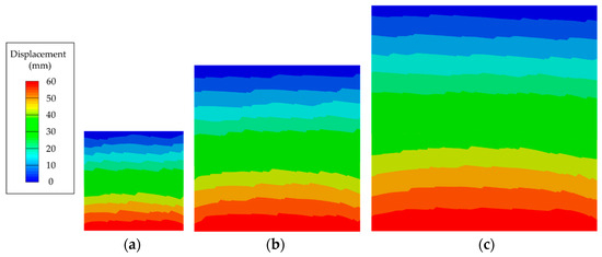 Distribution diagram of rock mass deformation under different sizes. (a) 6 m × 6 m; (b) 10 m × 10 m; (c) 14 m × 14 m.