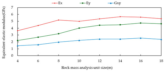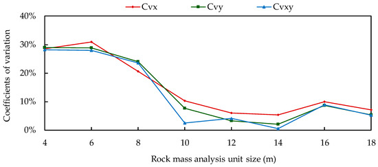 By applying loading boundary conditions in various directions and sizes to rock mass analysis units, a simulation of the deformation field was carried out. The results, which are shown in Table 3, include the variation curves of the x-direction-equivalent elastic modulus (Ex), the y-direction-equivalent elastic modulus (Ey), and the xy-plane-equivalent shear modulus (Gxy) with respect to rock mass analysis unit size, as depicted in Figure 12. The upper and lower limits of the effective equivalent parameters were established based on the calculation results for an 18 m × 18 m-sized rock mass analysis unit, using an acceptable error of 10% [38,39]. When the rock mass analysis unit size is taken as 10 m × 10 m or larger, the calculated values for Ex, Ey, and Gxy are all within the acceptable error range, and there are no significant fluctuations with changing rock mass analysis unit size, satisfying quasi-constant properties. In order to investigate the tensor-like properties, it is necessary to analyze the coefficients of variation in different directions (0°, 30°, 60°, 90°, 120°, 150°, 180°, 210°, 270°, 300°, and 330°) of the analysis units. The relationship between the coefficient of variation (Cvx, Cvy, and Cvxy) and the rock mass analysis unit size is shown in Figure 13. When the rock mass analysis unit size is greater than 10 m × 10 m, all the coefficients of variation no longer exhibit significant changes, and the calculated values fall within the acceptable error range, satisfying quasi-tensor characteristics.