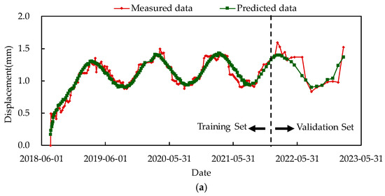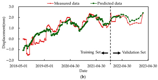 The fitting and predictive results are shown in Figure 14a,b. These figures illustrate that the predictive model proposed in this paper exhibits strong fitting and predictive capabilities, accurately reflecting the overall deformation patterns of the rock reservoir bank slope. However, the process of acquiring slope deformation monitoring data is inevitably affected by factors such as human error, external interference, and equipment failures. This results in irregular jumps in the monitoring data, particularly noticeable in the early stages of monitoring for measurement point M4xn1-2 (prior to 1 May 2019), leading to poor fitting performance during this period. Since there is no systematic pattern in the errors between measured and predicted data, no correlation with environmental variables, and no detected structural changes in the slope, these errors are likely caused by external random factors such as monitoring uncertainties and rock mass properties.