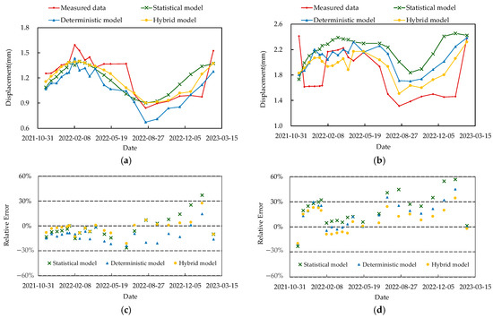 Figure 15a,b presents a comparative diagram of the prediction results from the traditional statistical model, the deterministic model, and the hybrid model. The figures indicate that the proposed hybrid model achieves better prediction results than other comparative methods, demonstrating the effectiveness of combining numerical simulation with statistical regression. Figure 15c,d present the relative errors of prediction results from the three models. The figures reveal that, on certain dates (e.g., 8 February 2022, and 9 January 2023), the statistical or deterministic models perform better. However, for the majority of dates, the hybrid model demonstrates superior predictive capability. Additionally, due to the relatively modest measured average values (1.25 mm and 1.82 mm) during the forecasting period, coupled with substantial fluctuations (0.75 mm and 1.11 mm) and poor regularity, this results in notable relative errors.