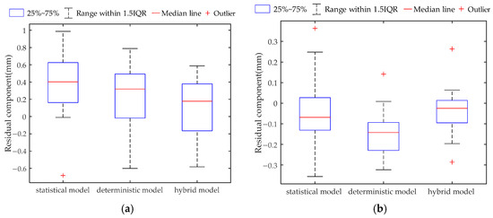 Residual boxplot results of two monitoring points. (a) M4xn1-1; (b) M4xn1-2.