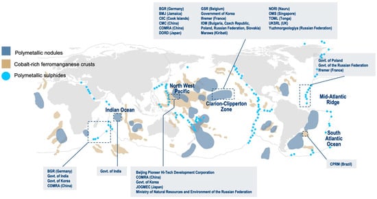 The expanse of the ocean, approximately 2.4 times that of terrestrial land, harbors abundant mineral resources []. Initially, there was sanguinity regarding the alleviation of pressure on terrestrial resource reservoirs through the extraction of oceanic minerals. In the early 1980s, a boom in Pacific manganese nodule exploitation ensued []. Countries and regions such as the United States, Europe, and Japan focused mainly on deep-sea polymetallic nodules, researching their own exploration and commercial mining schemes [], while also conducting experimental mining technologies for cobalt-rich crusts and polymetallic sulfides, including in the Red Sea and near Japan. Nevertheless, due to the nebulous commercial outlook, nations curtailed their investment in deep-sea mining research []. By the late 1980s and early 1990s, South Korea, India, and China sequentially joined the expedition for deep-sea mineral resource development, endeavoring to explore commercial mining solutions (see Figure 1).