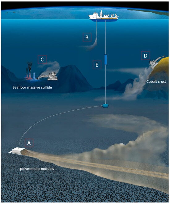 Pipeline-lifting mining systems: (A) a polymetallic nodule mining operation using a single collector vehicle and (B) possible associated return water discharge. (C) A seafloor massive sulfide mining operation around a hydrothermal vent site. (D) A cobalt crust mining operation on the flank of a seamount. (E) deep-sea lifting pump [].