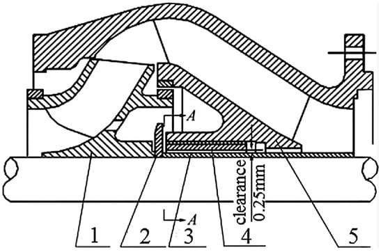 Deep-sea lift pump with bowl diffuser []. 1—Impeller, 2—Sand tray, 3—Shaft sleeve, 4—Bearing, 5—Bowl diffuser.