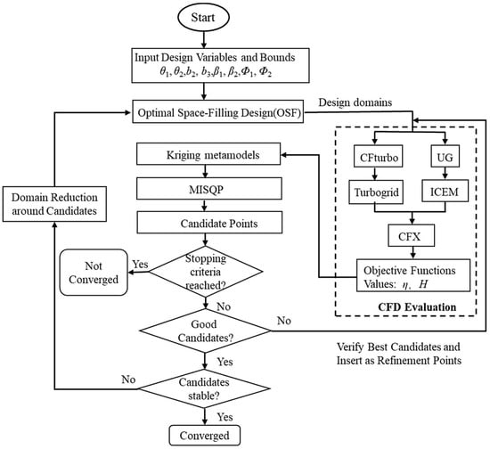 As the most critical component for energy conversion in pumps, the impeller significantly influences pump performance and is the focus of optimization []. Kim et al. [], Hao et al. [], and Zhang et al. [] optimized multiphase pump impellers, obtaining improved models with increased head and efficiency. Zhang et al. [] proposed a multi-objective optimization method combining numerical computation, Latin hypercube design (LHS), Kriging surrogate modeling, and genetic algorithm (GA) to optimize the radial parameters of double-suction pump impellers. Hong et al. [] optimized the slurry pump using the RSM method, achieving a 29.5% reduction in average impeller wear intensity while meeting the requirements for head and efficiency. As energy-consuming components, guide vanes should minimize energy losses to enhance pump performance. Kim et al. [] optimized mixed-flow pump diffusers using radial basis neural network (RBNN) models and SQP optimization algorithms based on numerical simulation results. While optimizing the impeller or guide vanes individually can enhance pump efficiency to some extent, both impeller and guide vanes collectively determine pump performance, and optimizing them separately may not yield optimal results. Li et al. [] treated the geometric parameters of the impeller and guide vanes as design variables, aiming to maximize efficiency at the design flow rate with the corresponding head as a constraint. The ASO optimization algorithm was employed, and Spearman correlation coefficient analysis was conducted to assess the correlation and sensitivity between variables and optimization objectives. As shown in Figure 5 this optimization method provides guidance for the design of centrifugal pumps with diffusers. Single-objective optimization often fails to meet the requirements for pump performance optimization under multiphase flow conditions. Researchers propose utilizing multi-objective optimization algorithms and machine learning methods to optimize various pump characteristics. Nourbakhsh et al. [] optimized centrifugal pumps using multi-objective particle swarm optimization (MOPSO) and multi-objective genetic algorithm (NSGA-II), demonstrating the feasibility of multi-objective optimization algorithms for pump optimization. Gan et al. [] proposed an improved multi-objective optimization method for centrifugal pumps combining particle swarm optimization with neural networks, resulting in significant efficiency improvements under three specified operating conditions and highlighting the correlation between impeller inlet conditions and pump performance in pipelines. Zhang et al. [] combined BP neural networks with NSGA-II, increasing the pressure rise of a helical axial multiphase pump by 10% and improving efficiency by 3%. Shojaeefard et al. [] optimized centrifugal pump inducers using neural networks and NSGA-II, achieving a 14.3% increase in pump head coefficient, a 0.3% increase in efficiency, and a 30.2% reduction in required net power. Xu et al. [] improved jet pumps using NSGA-II and radial basis function (RBF) neural networks, resulting in a 30.46% increase in pump head and a slight improvement in efficiency. Cui et al. [] optimized the impellers of multi-stage submersible electric pumps while maintaining constant blade total load and head to improve efficiency. By analyzing the performance and flow of 18-stage submersible electric pumps, an optimized scheme comprising front, intermediate, and rear stages was determined. Under design conditions, impeller outlet flow losses and pressure pulsations decreased, and the interaction between impellers and guide vanes weakened. This led to a reduction in unstable flow phenomena such as secondary flows and vortices, improving flow stability at the impeller outlet. Hu et al. [] proposed a multi-objective optimization strategy based on genetic algorithm backpropagation (GABP) neural networks and non-dominated sorting genetic algorithm III (NSGA-III), enhancing the hydraulic performance of deep-sea mining pumps. Under rated solid–liquid two-phase flow conditions, the head still met design requirements, with a 15.64% decrease in shaft power and a 6.00% increase in efficiency. Kim et al. [] designed multiphase pumps using multi-objective optimization design techniques, establishing optimization models using response surface methodology and analyzing the effects of GVF on multiphase flow performance in the optimization model. Peng et al. [] jointly optimized the impeller and guide vanes of multiphase mixed-flow pumps. Initial response surface models were established using minimal point design experiments, followed by various adaptive refinement methods to improve the accuracy of the response surface.