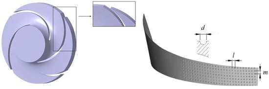 The degree of wear particles on solid surfaces is not only related to the properties of the solid material but also depends on the geometric shape of the solid surface. Different surface geometries can change the form of interaction between particles and solid surfaces, thereby significantly affecting wear, such as the angle and speed of particle collisions, the distribution and dynamic changes in the collision region, and the impact of the flow field on particle movement. Nature has evolved biological structures that reduce drag and wear [], such as the striped scale structures found on shark skin. These groove structures can change the structure and velocity distribution of the turbulent boundary layer on the skin surface during swimming []. Li et al. [] combined drag-reduction technology of non-smooth surfaces with the solid–liquid two-phase flow in centrifugal pumps. Gu et al. [], based on the theory of drag reduction by non-smooth surfaces (see Figure 7), established a pit-type non-smooth blade surface model and analyzed the impact of actual non-smooth surfaces on blade surfaces and the effect of solid volume fraction on centrifugal pump performance through numerical simulation. The study showed that blades treated with special surface treatments could effectively reduce the frictional resistance and energy loss between the fluid and the wall. With the same solid particle volume concentration, the shear stress produced by solid particles on non-smooth surfaces is generally lower than that on smooth surfaces. With the increase in flow rate, non-smooth surfaces show a better effect in reducing shear stress, which can effectively improve the head and efficiency of centrifugal pumps.
