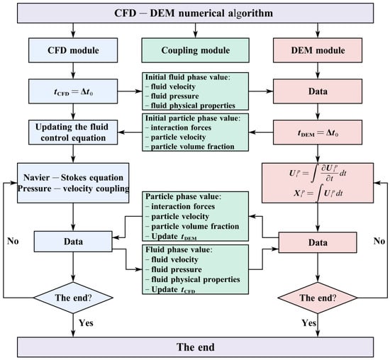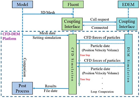 Among many commercial and open-source computational fluid dynamics (CFD) software such as ANSYS Fluent, Siemens STAR-CCM+, Open FOAM, MFiX, Hyperworks CFD, users can obtain flow field information through them. As mentioned earlier, (DEM) modeling is performed at the scale of individual particles, while CFD solutions for fluid flow are implemented at the computational cell level. By combining CFD and DEM, the flow behavior of particles and fluids can be reasonably simulated. Since the pioneering CFD and DEM coupling research conducted by Tsuji et al. [], CFD-DEM coupling models have become widely adopted methods for applications involving interactions between fluid and particle phases [,,]. The Fluent and EDEM coupling method is widely used in CFD-DEM calculations, with the specific process outlined in Figure 8. The two software packages establish a data bridge through a data interface, exchanging simulation data at each time step. Fluent transfers the particle forces generated by the flow field to EDEM, where EDEM computes the Lagrange motion of particles and updates their position, velocity, and volume data through the data bridge. Fluent calculates particle forces on the fluid and updates the changes in the flow field for the next time step, while the DEM solver is responsible for tracking each particle in the computational domain.