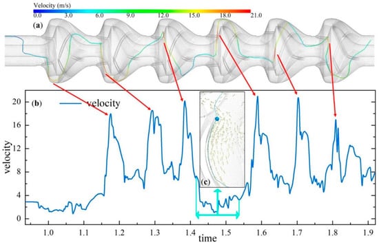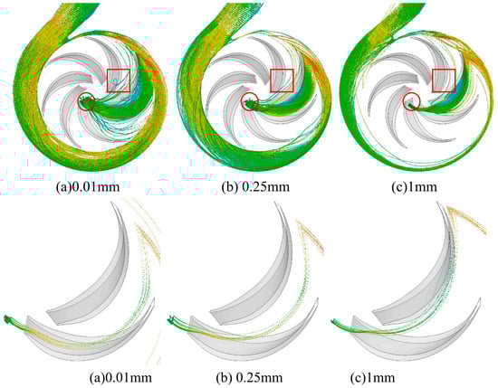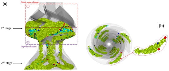 The two-phase flow in deep-sea lifting pumps involves multiscale interfacial coupling and multi-physical reaction processes []. Complex forces exist between fluid and solid particles, and understanding the internal flow distribution and particle motion patterns is crucial for addressing the performance of deep-sea lifting pumps. Over the past few decades, several numerical strategies have been developed to describe particle flows. At present, there are two main methods to simulate particle phase in liquid: Euler–Euler method and Euler–Lagrange method. In the mid-20th century, scientists endeavored to develop effective methodologies for describing and predicting the behavior of multiphase flow systems by solving the equations governing mass, momentum, and energy conservation in granular fluid systems using Euler–Euler methods [,]. The Euler–Euler modeling is suitable for one or two particle sizes, rather than a wide range of particle size distributions. Additionally, the model does not offer information regarding the residence time of individual reactive particles. To address this problem, scientists track the motion of material particles in the fluid through the Euler–Lagrange method, where the fluid is considered as a continuous phase in computational fluid dynamics (CFD) and solved by the Navier–Stokes equations, while particles are modeled using the Discrete Phase Model (DPM) introduced by Gidaspow and Strack []. The discrete element method (DEM) is a powerful numerical simulation tool for solving Newton’s second law and reproducing the flow of discrete media, making it suitable for numerical simulation of two-phase flow in slurry pumps [].