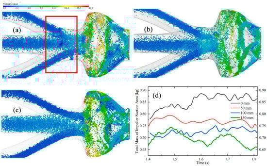 Due to the continuous pressurization in multi-stage pumps, the total axial thrust on the impellers can reach several tens of tons, threatening the stable operation of the pump. Moreover, improper design of balancing devices can lead to bearing overload, collisions between moving and stationary parts, and pump shaft fractures []. Kang et al. [] conducted a study on the axial thrust and hydraulic performance of deep-sea mining pumps. A computational fluid dynamics model of a two-stage centrifugal pump was established using the full-flow field method. The numerical simulation of the transportation process of pure liquids and solid–liquid mixtures was carried out using an actual mining pump as the research subject. The results indicated that the position of the balancing holes has a minimal impact on the hydraulic performance and thrust of the pump. Larger hole diameters can help increase the flow rate and the capacity to balance axial thrust, but they also lead to more significant flow losses and poorer hydraulic performance (see Figure 6).