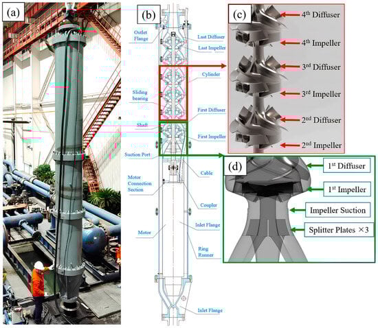 Currently, research into key technologies for deep-sea mining and the development of commercial mining solutions are focused on pipeline lift mining systems (see Figure 3). The system is mainly composed of the mining truck subsystem, lifting subsystem, mother ship subsystem with auxiliary support, and deep discharge subsystem. The systems use hydraulic or pneumatic lifting technology to efficiently transport seabed ore to the surface. Central to this process is the deep-sea lifting pump, a pivotal component of the hydraulic lifting system that directly influences the reliability of the entire mining apparatus. The deep-sea lifting pump is the key component of the hydraulic lifting system to achieve this process method, which directly determines the reliability of the entire mining system []. In 1978, Ocean Management Company (OMI) successfully mined 800t of nodules in the deep-sea area of the Eastern Pacific Equatorial Sea through a six-level deep-sea lifting pump with a bowl diffuser developed by KSB [].