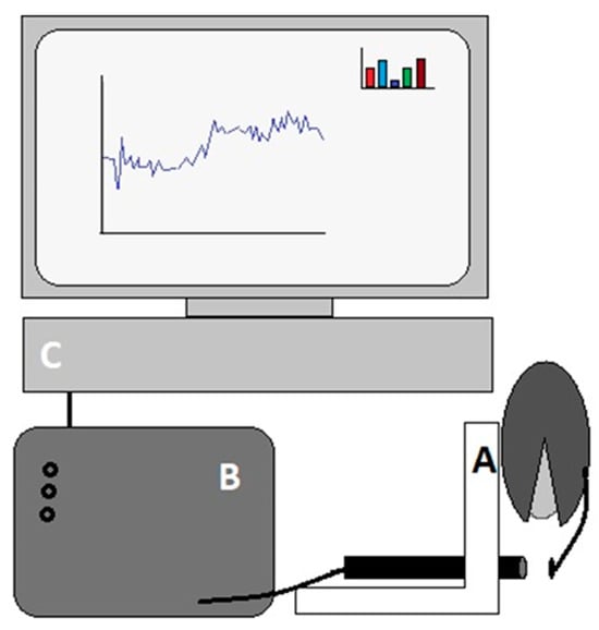 Scheme of mussel activity testing system: (A) mussel with magnet and Hall sensor (B) data processing module with software (C) computer.