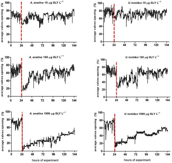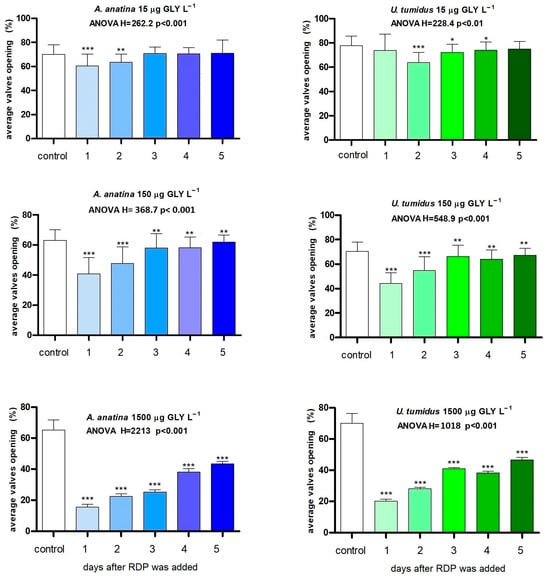 Exposure to RDP herbicide induced dose-dependent filtration abnormalities in both species. During the survey with the lowest concentration of herbicide (15 µg GLY L−1), the application of the RDP induced a response—a reduction in the valves opening (Figure 3). The average shell dilation of the A. anatina population decreased from almost 70% to 43%. These values remained for approximately 1.5 h, after which the average opening of the shells began to slowly increase. In particular, for specimens of A. anatina, the response to the appearance of the herbicide varied. Three individuals did not react significantly, while one completely closed its shell. On the second day after the herbicide exposure, the A. anatina filtration activity decreased, and the average shell opening was slightly lower than 40%. On subsequent days, no differences were noted compared to the control (Figure 4). The response of U. tumidus to the lower concentrations of RDP was less distinct. After herbicide application, the average shell opening decreased from 70% to 60% and then 55%, and remained at this level for a few hours. However, the lowest average opening was lower (47%) during the control period. The lowest average filtering activity was observed on the second day after herbicide administration, with a valve opening of lower than 40% (Figure 3). Despite the fact that the differences in the average opening of the shells on individual days of the experiments were low, statistical analysis revealed a significant difference between the control and the study period (Figure 4).