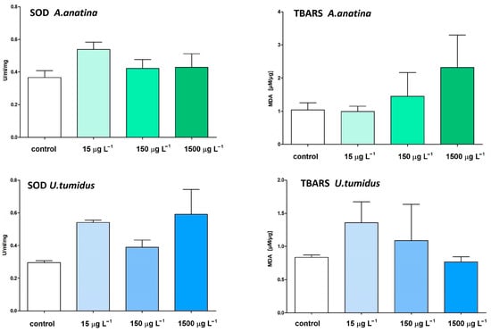 Exposure of both studied mussel species to RDP resulted in an increase in SOD enzymatic activity (Figure 5). In the case of A. anatina, the greatest increase in SOD activity compared to that in the control group was noted after exposure to the lowest RDP concentration of (15 µg GLY L−1), and the average level of superoxide dismutase activity in gills tissue was more than 40% greater (Figure 5). At higher concentrations of the RDP, the differences compared to those in the control group were less significant. Additionally for U. tumidus, exposure to the pesticide resulted in increased levels of SOD activity. In this species, the most significant increase in SOD activity was observed after the exposure to the highest RDP concentration (Figure 5). Statistical analysis did not reveal significant differences in SOD activity between the control and test groups. However, for the lowest dose for A. anatina and the highest for U. tumidus, the post hoc test values were p = 0.0542 and p = 0.0580, respectively.