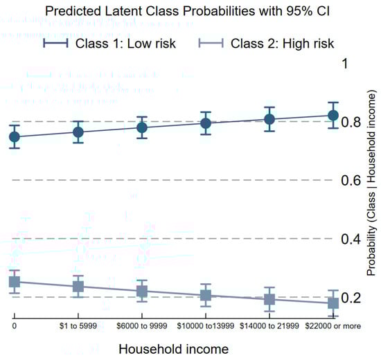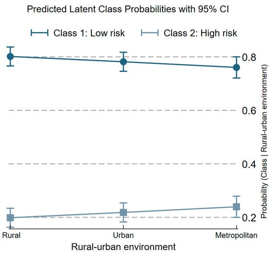 Figure 2 reveals that the probability of households belonging to the low-risk profile increases as household income increases; consequently, the probability of belonging to the high-risk profile decreases as household income increases. Figure 3 shows the probability of households belonging to a low- or high-risk profile given the rural or urban environment.