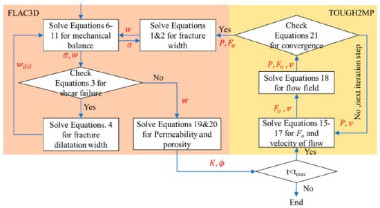 The coupling mode is shown in Figure 1. In each time step, TOUGH2MP collects variables from each processor and then sends them to FLAC3D for updates to permeability, porosity, and volume strain within the fractured rock. The newly obtained values of each element are transferred back to TOUGH2MP and distributed on each processor to calculate the corresponding changes in hydraulic properties. For more detailed information, refer to the literature by Liao et al. [].
