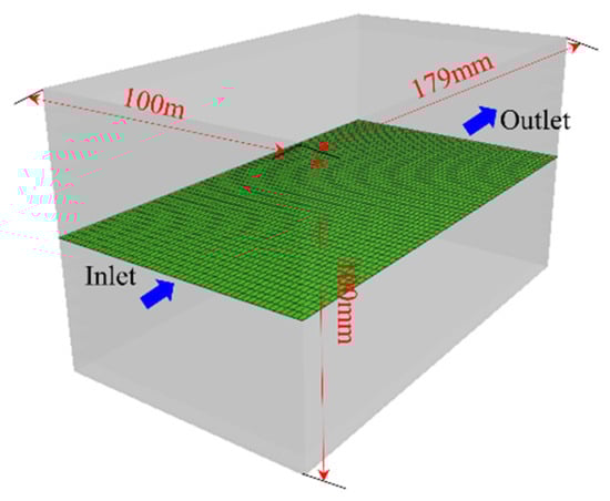 To validate the HM coupling model, a cubic model is generated with dimensions of 179 mm × 100 mm × 100 mm, following similar settings as in the experiments by Rong et al. []. As shown in Figure 2, a fracture with an initial width of 1.39 mm is embedded in the middle. A normal stress of 3.0 MPa was applied to the top side, and the normal displacement on the bottom boundary was fixed. The empirical constant q = 1.46 × 10−6 was adopted. Water was injected at the left side at a constant rate, the right side was left for free outflow, and the inlet pressure was recorded under different injection rates.