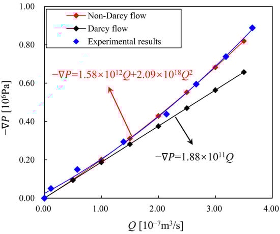 where represents the Darcy flow part; represents the non-Darcy flow part; A and B are two parameters for the Forchheimer formula, which can be calculated according to Equation (14):