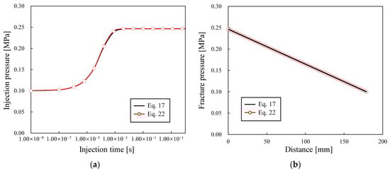 To validate the plausibility of fluid velocity calculated by a simplified Equation (17), the results are compared to the results calculated by a precise Equation (22), including the injection pressure and the pressure along the fracture after 10 days. The numerical model settings and applied parameters are the same as in the experiments by Rong et al. [], with a constant injection rate of 3.5 × 10−7 m3/s. As shown in Figure 4, the injection pressure and fracture pressure match very well in the two calculated methods, which validates the plausibility of the fluid velocity calculated the simplified Equation (17). In additional, the fracture deformation and stress state variation of this model have been previously verified, with more detailed information available in the work by Li et al. [].