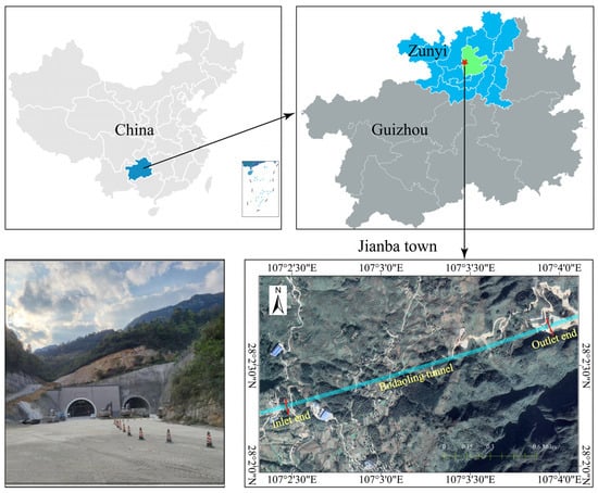 The project is situated in the northern Guizhou plateau region of China and characterized by an erosive karst landform. As shown in Figure 5, the entrance side features sloping terrain with a natural slope ranging from 15° to 25°. The tunnel section traverses a mountain ridge, with the highest point at an elevation of 1288.3 m. On the exit side, the terrain transitions into a river valley landscape with natural slopes ranging from 25° to 65°.