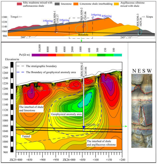 In the site area, the surrounding rock is mainly limestone shale interbedding and argillaceous siltstone mixed with shale. As shown in Figure 6, within the influence range of the tunnel route, there are four springs. These springs are the source of drinking water for local residents and have a consistent, year-round flow rate of Q = 1~10 L/s. From rock samples taken from the borehole, BDSLDS-2 reveals a relatively fractured surrounding rock mass, making water inflow likely during excavation, as shown in Figure 7. Based on field observation, the flow rate ranges from 1 to 10 L/s when there is no rainfall and can reach 100 L/s in the rainy season, posing significant challenges to the construction safety and potential danger to personnel and property. The alteration in groundwater distribution due to tunnel excavation may have an impact on the water safety of local residents. Therefore, it is essential to estimate the water inflow during tunnel excavation in order to develop appropriate countermeasures.