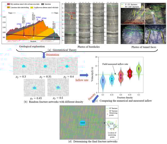 Determining process for fracture networks: (a) inference evidence for the fracture orientation in target site; (b) randomly generated fracture network with different densities; (c) comparing the numerical results of different dense fracture networks with field-measured inflow rate; (d) determining the final fracture networks for simulation.