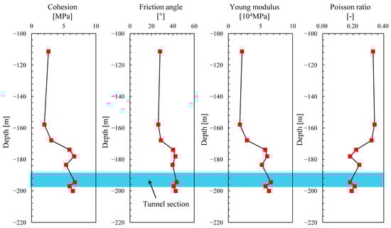 The uniaxial and direct shear tests were conducted on the intact cores from BDSDS-2 at nine different depths. The corresponding Young’s modulus, Poisson’s ratio, cohesion, and friction angle along depth are plotted in Figure 9. Young’s modulus, cohesion, and friction angle increase with depth, whereas Poisson’s ratio decreases with depth. Since the target tunnel section for water inflow is approximately 25 m away from the BDSDS-2 borehole, the corresponding mechanical properties of intact rock (Young’s modulus, Poisson’s ratio, cohesion, and friction angle) were derived from the lab result of BDSDS-2 at the depth of the tunnel section. Due to the restoration of ground stress influence on mechanical parameters and the damage to the fractured core during drilling, the mechanical properties of the fractured rock mass are referenced from literature sources. Additionally, hydraulic parameters, such as permeability and porosity, were determined based on empirical data from previous studies on limestone [,,,,].