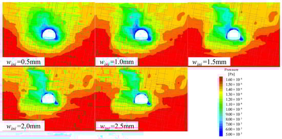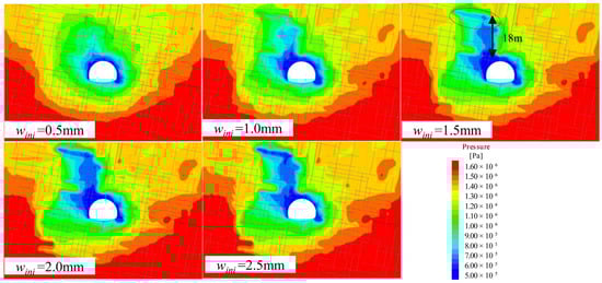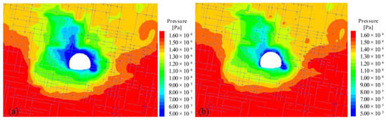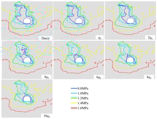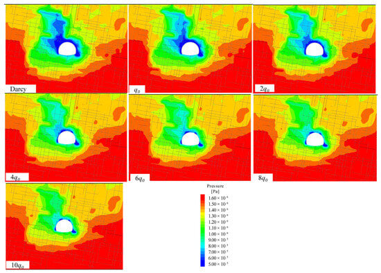 The temporal total inflow rate of non-Darcy and Darcy flow along the entire tunnel section are compared in Figure 11. The inflow rate is very high during the initial stage and rapidly decreased to a stationary inflow rate within roughly 2 s. In the stationary state, the total inflow rate of Darcy flow along the entire tunnel section was 25% lower than that of non-Darcy flow, highlighting the importance of the non-Darcy effect in predicting tunnel inflow. The pressure contour of Darcy flow and non-Darcy flow in a stationary state are compared in Figure 12 and Figure 13. The low-pressure region significantly infiltrates the upper-left corner along the fractures, and the extent of infiltration in Darcy flow is much greater than that in non-Darcy flow. This is because the high flow rate is attenuated by the non-Darcy effect, which limits the extension of the low-pressure area.