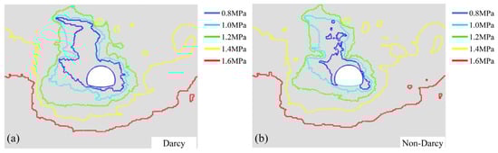 Pressure contours after 1440 s: (a) Darcy flow, (b) non-Darcy flow.