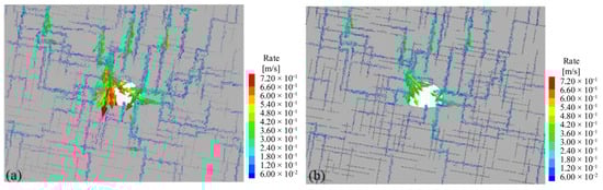 Flow vectors after 1440 s: (a) Darcy flow, (b) non-Darcy flow.